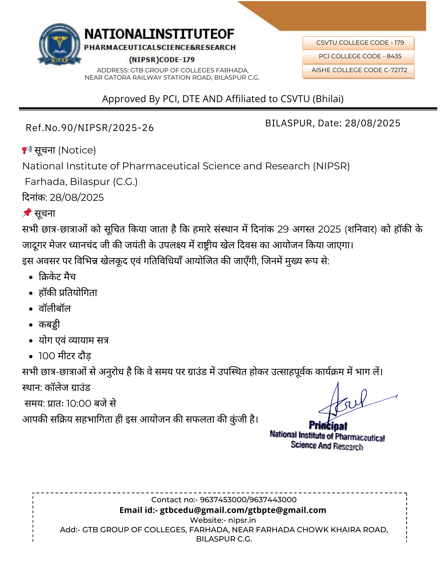 09.05.2024 को जीटीबी ग्रुप ऑफ कॉलेजेस (NIPSR - PHARMACY COLLEGE - 179) फरहदा, बिलासपुर ....